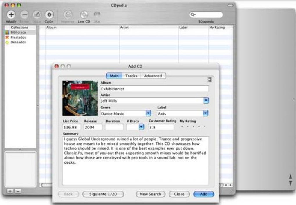Espléndido gestor de colecciones de CD, CDpedia lo tiene todo, o casi todo. CDpedia brinda soporte freedb y Amazon para importar los datos de tus álbumes de audio, pero no enlaza con una base de datos en español. Sin embargo, viene en español y con un look iTunes, lo que nos familiariza enseguida con él.